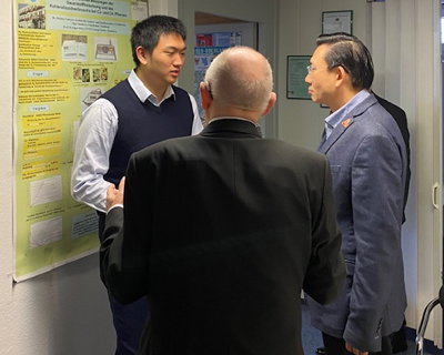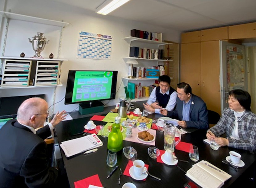 Prof. Dr. Edgar O. Klose stellt die Tätigkeitsfelder des Forschungsinstitutes dar: Frau Shi, Herr Wei, Herr Zhou, Prof. Dr. Klose (von rechts nach links).