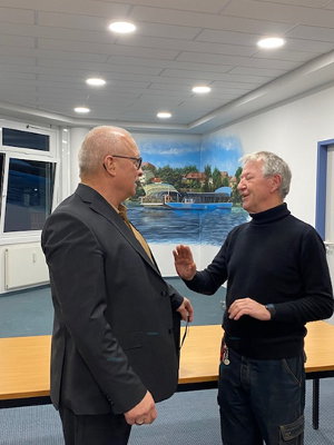 Begrüßung und intensive Gespräche zwischen:(Bild 1) dem Bürgermeister der Stadt Müncheberg, Herrn Streichert (links), und dem österreichischen Mitglied, Herrn Reissegger (rechts);(Bild 2) dem Herrn Wolter (links) und dem Schatzmeister, Herrn Rozok (rechts); (Bild 3) dem Herrn Karl (links) und dem neuen Mitglied, Frau Moreno Garcia (rechts).